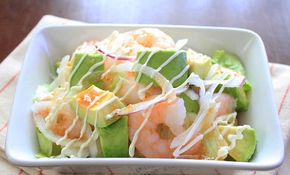 새우(중) 10마리, 올리브오일 1티스푼, 소금 한꼬집, 후추 한꼬집, 아보카도 1/2개, 레몬즙 1/2티스푼, 마요네즈 2티스푼, 폰즈소스 1티스푼, 김가루 한꼬집(기호에 따라)