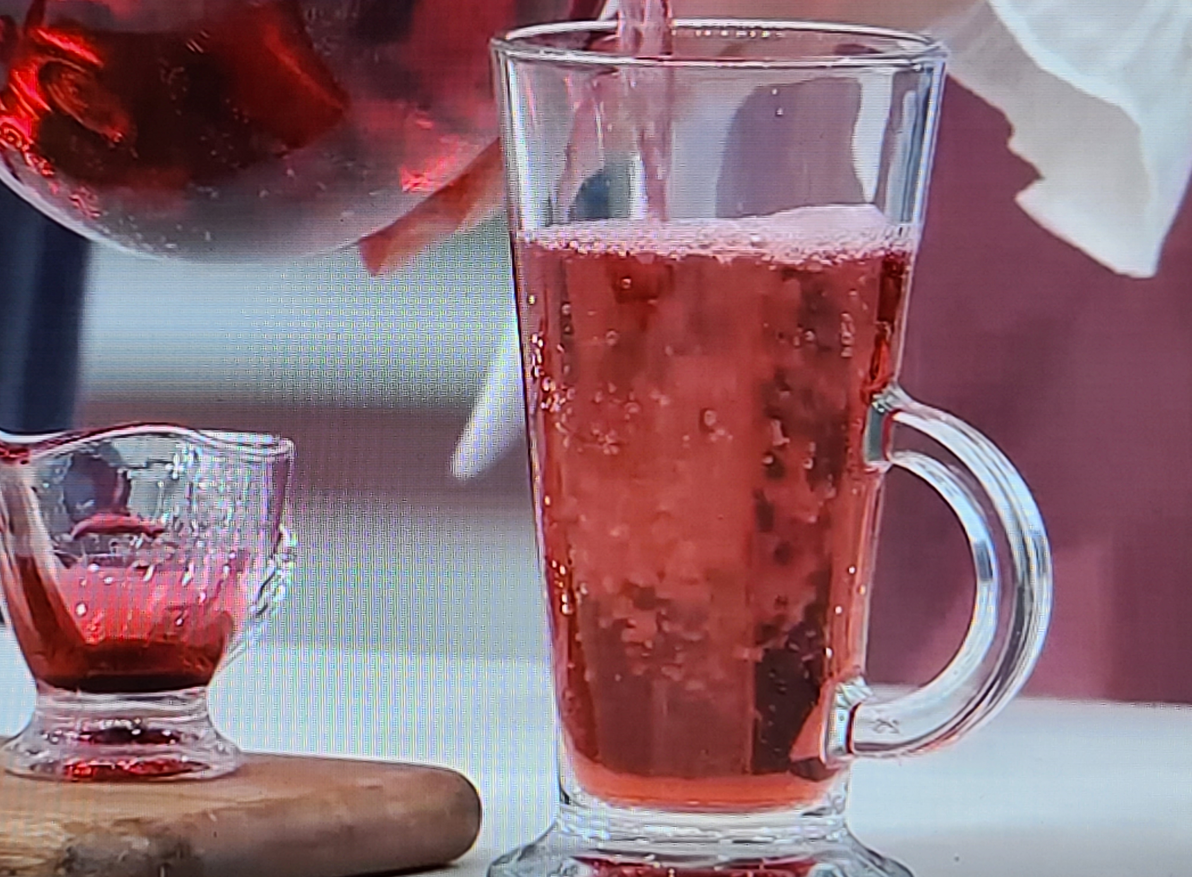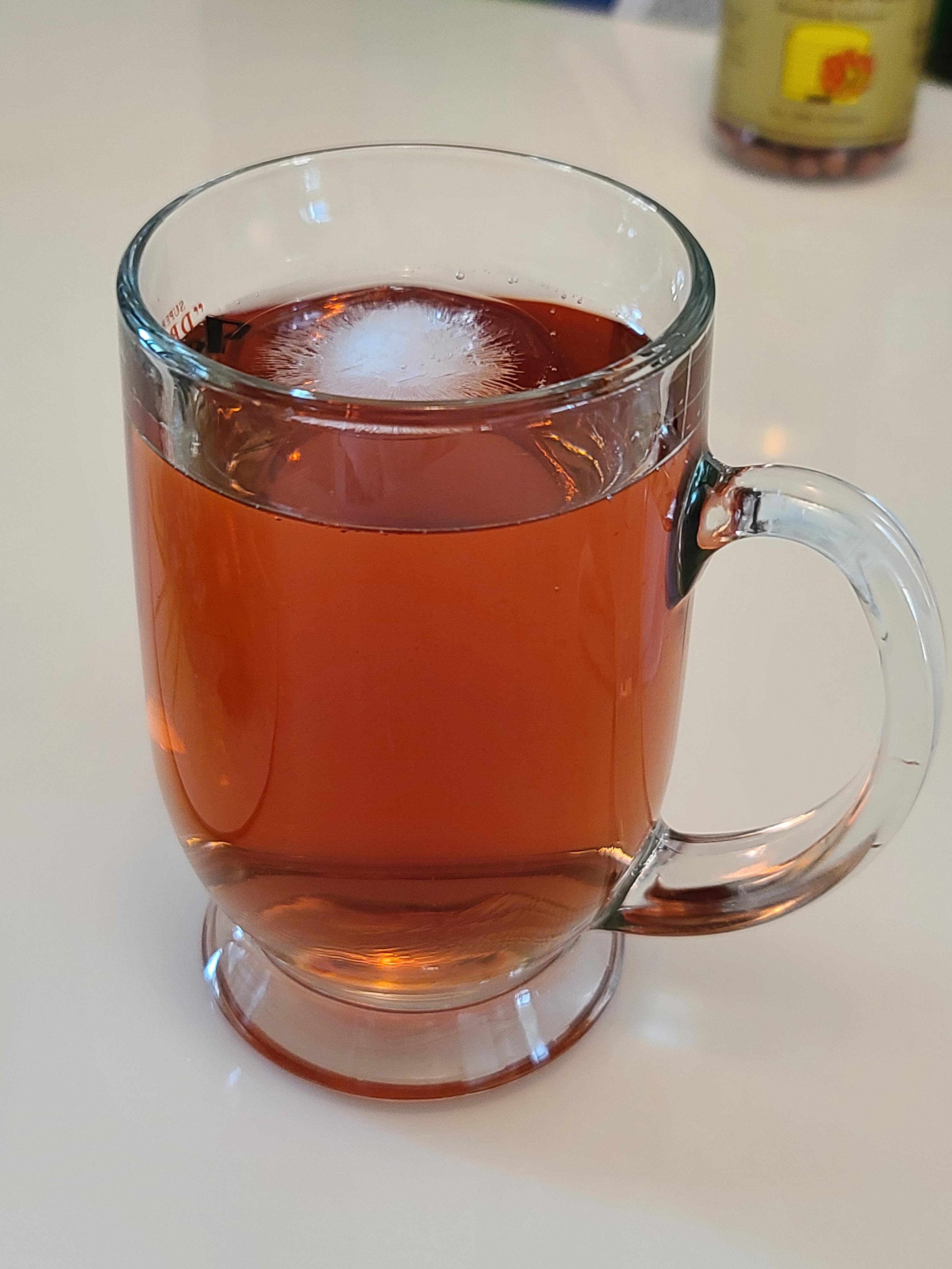 위스키잔(30ml)에 큰 얼음 1개를 띄우고 물을 200ml정도 부어서 만들었습니다. 주스 색은 진한 체리주스 색과 동일합니다. 진한 자줏빛.
