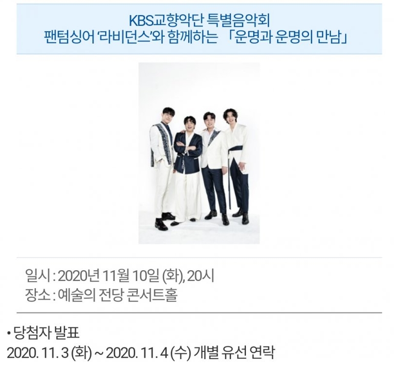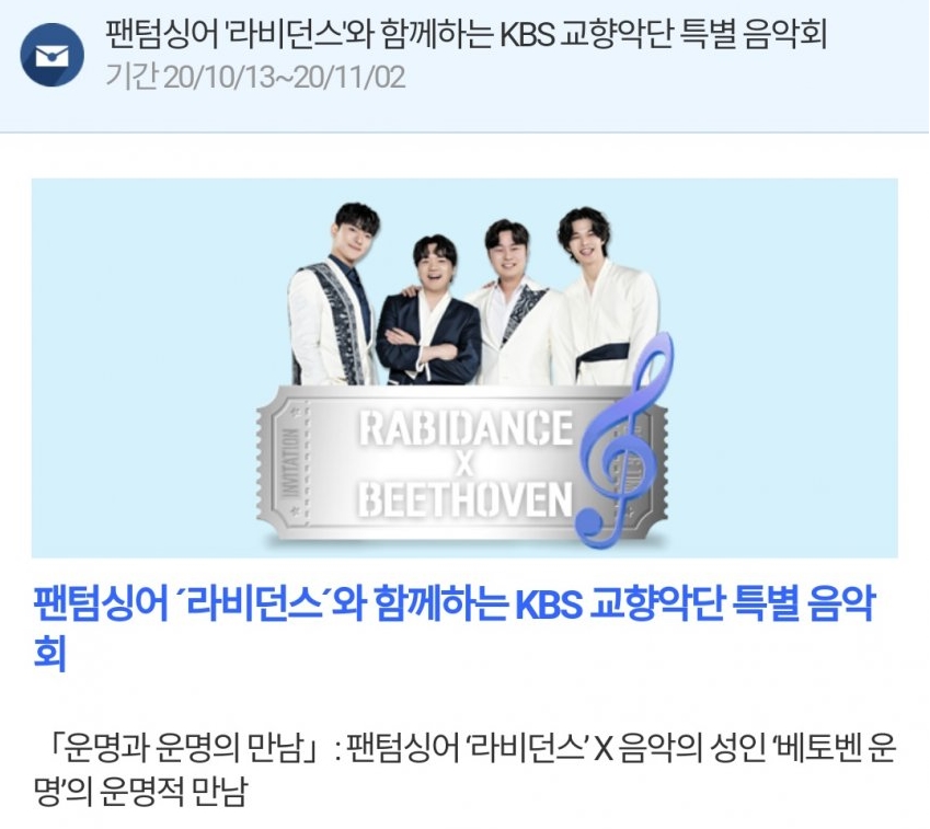 예술의 전당에서 KBS교향악단과 함께 하는 콘서트. 라비던스 완전체로 예전이라니! KBS교향악단과 협연이라니. 베토벤이라니!! 이게 무슨 일입니까? ㅠ.ㅠ 그런데 우리카드를 만든 사람 중에 추첨에 당첨이 되어야 갈 수 있는 콘서트라네요. 그런 행운이 나에게 있을리가... 누군가 다녀오시면 후기 좀 냄겨주세요. 완전체 공연 진짜 보고 시프다! 라비던스와 베토벤! 기대 된당!