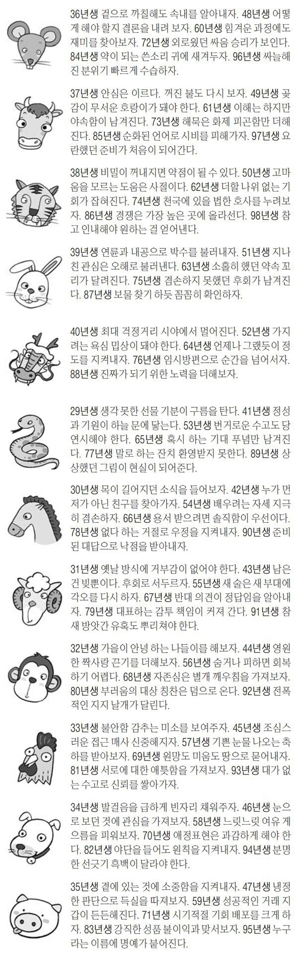 84년생 잡다한 일로 많은 시간을 뺏기기 쉬우니 철저한 시간관리가 필요하다. 72년생 시동이 한 번 걸리기 시작하면 제어하기 어려우니 아예 시작도 하지 마라. 60년생 하기 싫어도 어쩔 수 없이 아쉬운 소리를 하게 된다. 48, 36년생 귀가 여려져서 이말 저말에 흔들리기 쉽다.