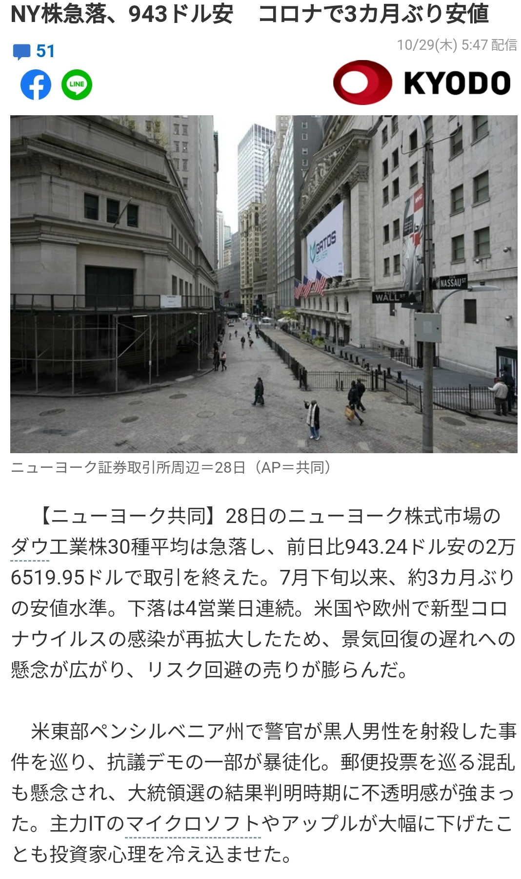 미국 동부 펜실베이니아주에서 경찰이 흑인 남성을 사살한 사건에 대한 시위대의 일부가 폭도화로 번졌다. 우편 투표를 둘러싼 혼란도 우려되며, 대선 결과 판명 시기에 대한 불투명감도가 짙어졌다. 주력 IT의 마이크로 소프트와 애플 주가가 대폭 하락한 것도 투자 심리를 위축시켰다.