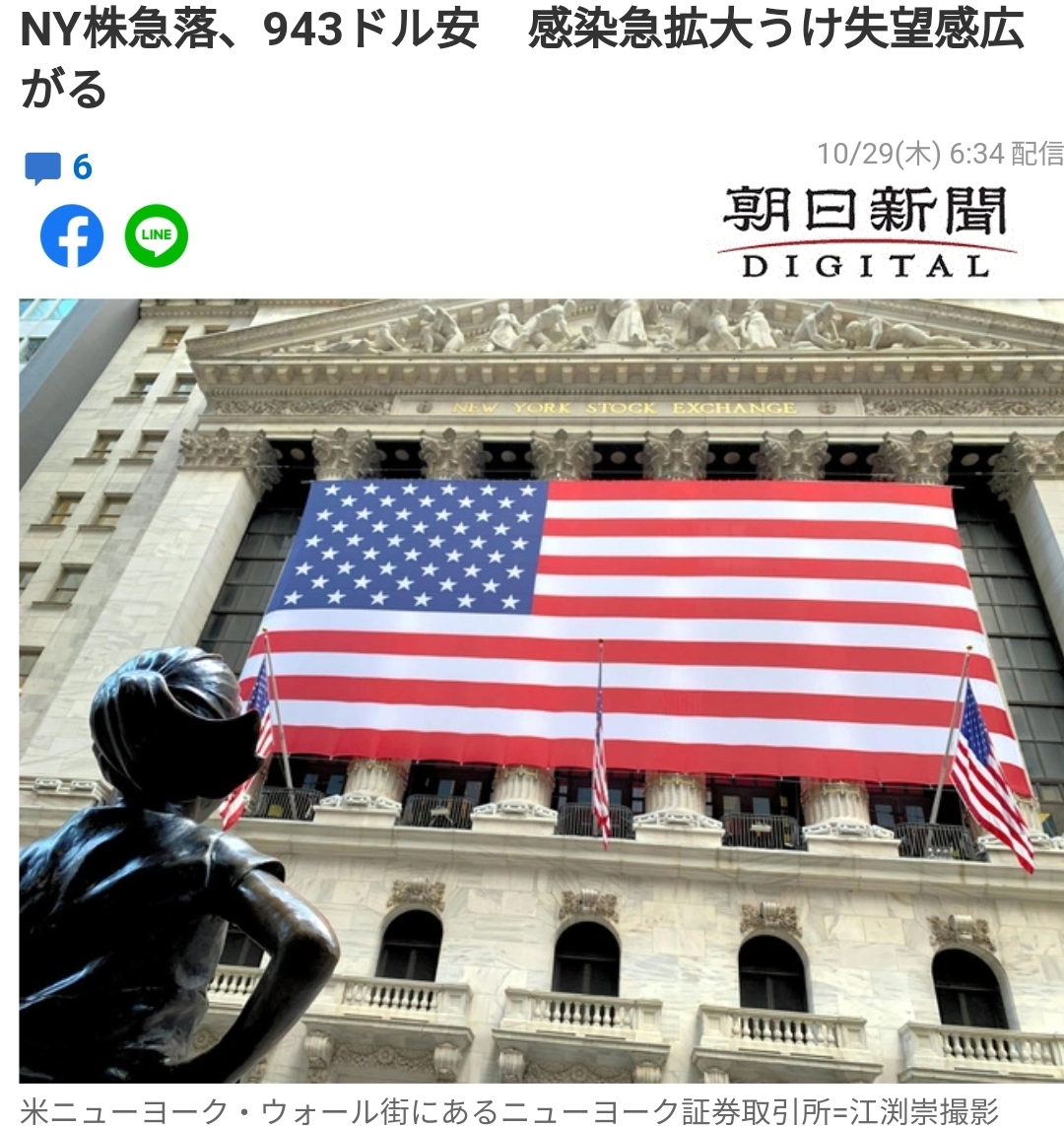 IT 등 하이테크주가 많은 나스닥시장의 종합지수도 큰폭으로 하락해 426.48포인트(3.73%) 내린 1만1004.87로 마감했다. 뉴욕타임드 집계에 따르면 하루 신규감염자수가 과거 1주일 평균 7만3천 명에 달해 2주 전부터 40%나 증가했다. 시카고를 필두로 여러 도시에서 식당 등 재규제에 들어갈 움직임을 보이고 있다. 한편 코로나 위기에 대처하는 추가경제대책을 둘러싸고 백악관과 의회여야당 간의 협의가 암초에 부딪쳤다. 11월3일 미국 대통령 선거 전에 통과될 기미가 보이지 않아 시장한 실망한 것이 증시하락 요인이 되고 있다.