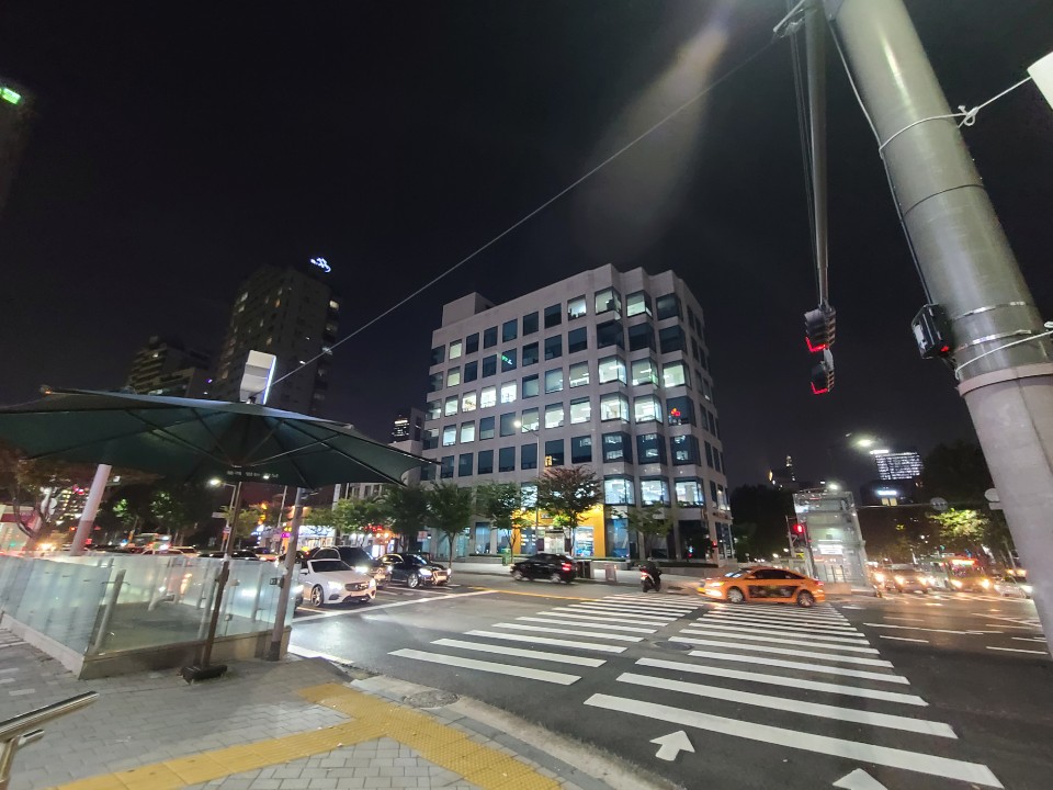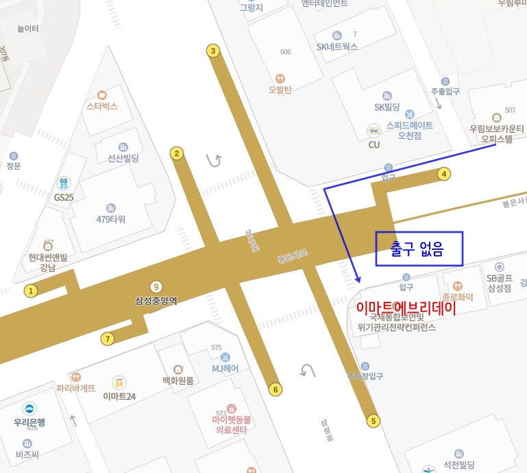 삼성중앙역 1번 출구쪽에서 찍은 사진입니다. 그런데 이 사진을 보시면 알겠지만 대로가 좀 넓습니다. 과연 삼성중앙역 1번, 2번 출구쪽에 사는 사람이 저기까지 뭔가를 사러 갈 것인지 생각해봐야 할 문제입니다.