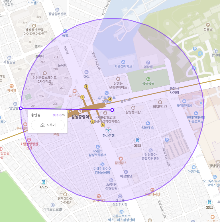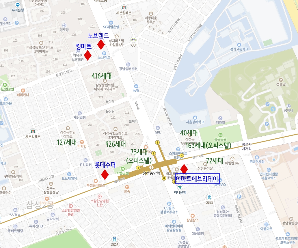 위의 이미지에서 보시다시피 우측 하단쪽의 해당 이마트에브리데이는 9호선 삼성중앙역 바로 앞에 있습니다. 주위에 삼성동더샾, 우림아파트, 우림보보스카운티 오피스텔, 힐스테이트2차, 한일아파트 등이 주변에 있습니다. 이곳을 이용할만한 세대수를 합쳐보니 1200~1300세대정도가 됩니다.