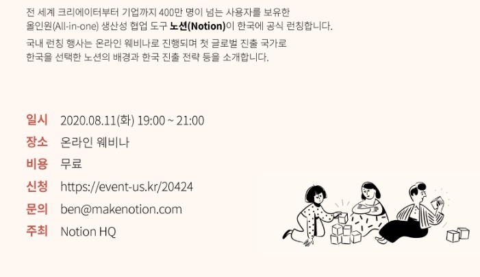 글로벌 기업 노션(Notion)의 한국어판 론칭 웨비나가 진행됩니다.