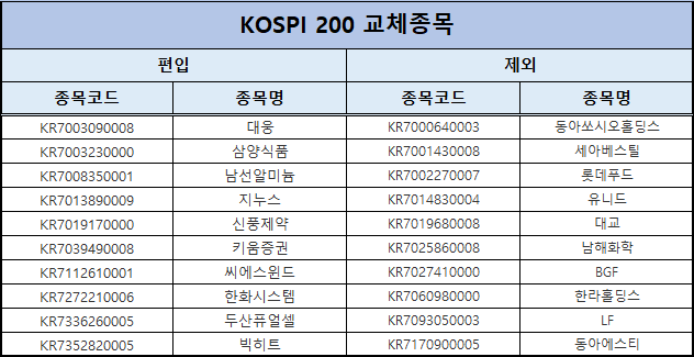 코스피200지수에 신규로 편입, 편출(제외)되면 해당 종목의 수급과 주가에 영향을 미칠 단기 이슈로 작용하기 때문에 관심 가지시면 좋을 것 같습니다. 그러나 단기적인 이슈라는 거 기억하시고 투자하세요.