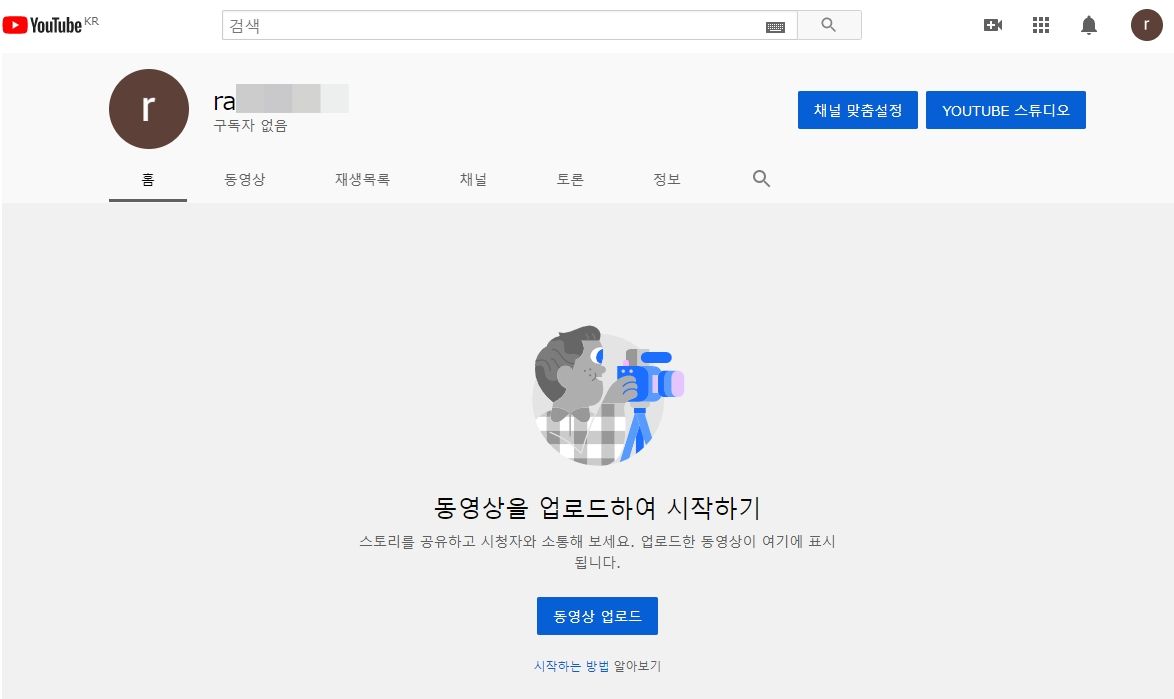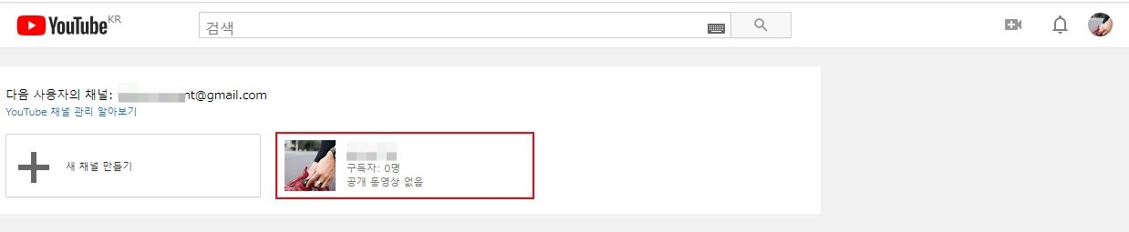 새로운 채널이 생성되었고, 우측 상단과 유튜브 로고 아래에서 확인 가능하듯 계정이 바뀐 것처럼 보이지만 사실은 계정이 바뀐 것이 아니고, 추가된 채널명을 내 이름(닉네임)처럼 사용하는 것입니다.