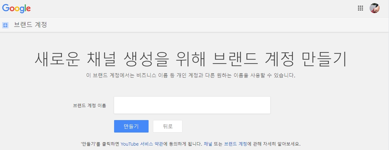 위의 화면에서 <+새 채널 만들기>를 클릭합니다. 아래와 같이 브랜드 계정 화면이 뜹니다. 브랜드 계정 이름에 닉네임으로 쓰고 싶은 이름을 입력하고 만들기 클릭