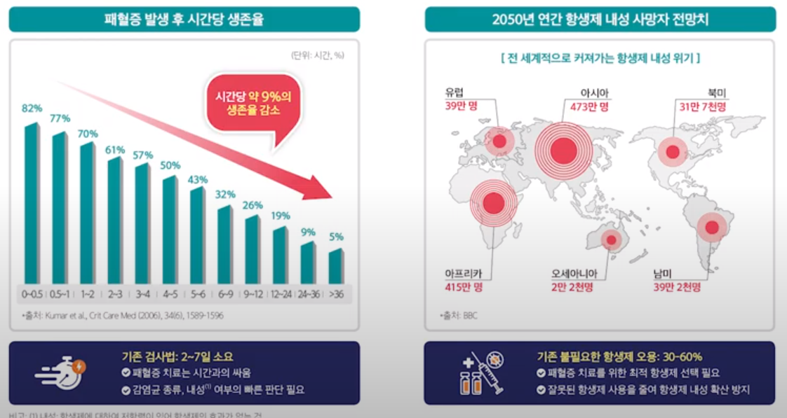 - 시간과의 싸움인데, 병원에서 사용하는 50여개의 항생제 중에 맞는 것을 사용하려면 검사가 필요하고 그 검사에 2~7일정도가 소요됩니다. 왜냐하면 미생물 배양 과정을 3회 거쳐야 결과가 나오기 때문이죠. 그래서 이 과정에서 환자들이 생명을 잃는 경우가 많다고.