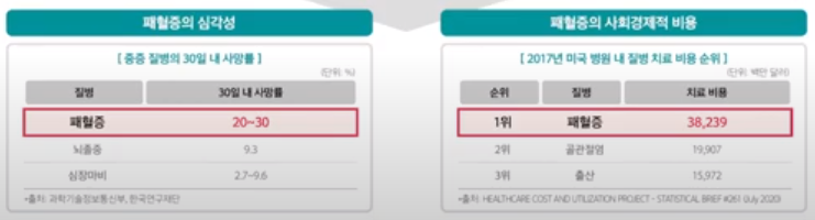 - 피에서 균이 발견되면 균혈증(면역시스템이 망가진 상황)이라고 하는데, 이때 몸 속에서 균이 자라면, 이 균을 처리하는 과정에서 독소 같은 것을 배출하게 됩니다. 그러면서 장기 손상이 오고 사망에 이르게 되는 거죠. 다른 질환으로 병원에 입원하지만 결국 사망하게 되는 원인은 패혈증인 경우가 가장 많다고 합니다. 3초에 1명 씩 사망하는 질환.