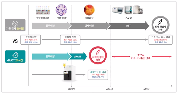 >>> 드라스트: 정재배양 과정을 건너뛰고 피의 혈구세포 등이 있는 상태에서도 정재배양한 것과 같은 결과를 도출 (하루 단축) > 항생제배양 자체도 빠르게 만듬 (하루 단축) ----- 총 하루 소요