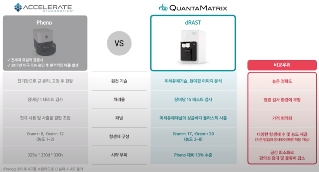 - 경쟁사는 미국 회사 1곳뿐이고, 상품성 면에서 퀀타매트릭스의 제품이 높게 평가 받고 있다고 합니다. 가장 큰 차이는 미국 회사의 제품은 장비 1개당 1샘플만 테스트가 가능하고, 퀀타매트릭스 장비다 15개 샘플의 테스트가 가능하다는 점입니다.