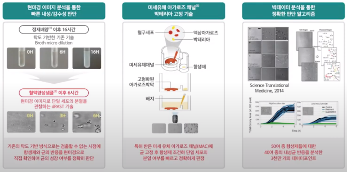 - dRAST: 현미경으로 균 하나하나를 관찰하면서 항생제 투여 > 3~4시간 관찰하면 10번 이상 분열하는 양상이 보임 > 이때 균을 관찰하기 위해 어딘가에 균을 고정하면 균이 분열을 잘 안 함 > 항생제 효과가 있는 듯한 착각을 불러 일으킴 > 그래서 균을 고정시킬 때 쓰는 플레이트(뉴스 등에 자주 나오는 투명하고 둥근 케이스)에 특허가 있음 > 균의 관찰에 대한 빅테이터를 구축해놓았기 때문에 균의 모양변화도 항생제 감수성 검사에 활용 > 시간 단축이 됨