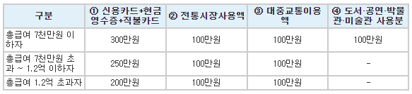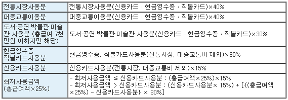 ※ 공제금액 = {(전통시장사용분+대중교통이용분+현금영수증, 직불ㆍ선불카드등사용분+신용카드사용분) - 최저사용금액}