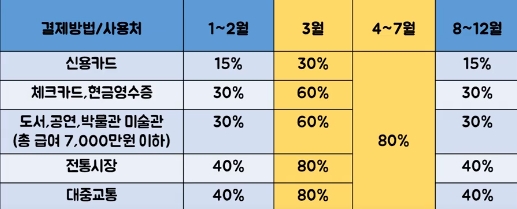 신용카드 등 사용금액의 합계액이 최저사용금액(총급여액의 25%)을 초과해야 공제가 가능합니다. 올해는 코로나19로 인해 한시적으로 3~7월 사이의 사용한 카드사용액의 공제율이 증가하였습니다.