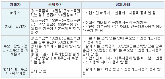 자녀, 형제자매 20세 이하, 부모 60세 이상, 연간소득 100만 원 이하(근로소득만 있는 경우 500만 원 이하)