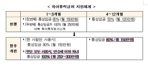 만약 부부가 동시에 육아휴직을 하면 3개월째에는 둘이 합쳐 600만 원을 지원 받게 됩니다. 순차적으로 휴직을 해도 각자 석 달간 월 최대 300만 원씩 받게 됩니다. 휴직 기간이 4개월~12개월로 늘어나면 부모가 각각 150만 원씩 받을 수 있게 되어, 총 1500만 원까지 받을 수 있게 된다고 하네요. 출산 1년 이내에 부모가 모두 육아휴직을 해야 더 많은 지원금을 받을 수 있다고 하는데, 이건 출산과 육아 부담을 엄마, 아빠가 함께 나눌 수 있게 하기 위함이라고 합니다.