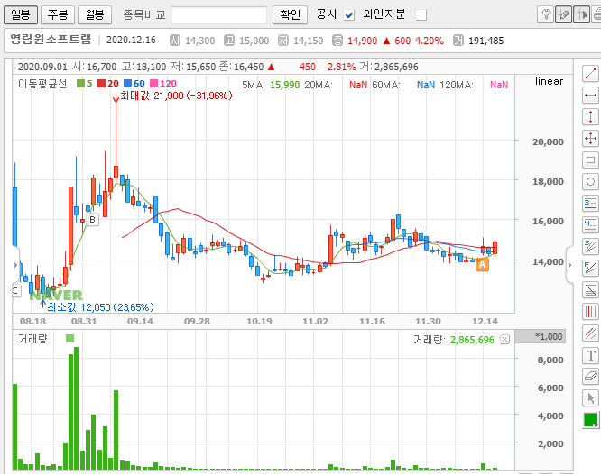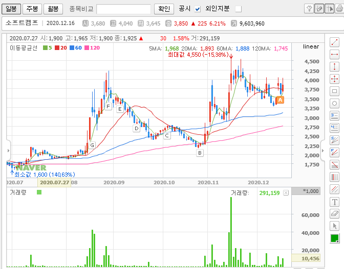 이게 12월14일 월요일 장 마감 후 차트인데요. 차트를 보면 장대 양봉 후에 계속 아래로 빠질 듯한 그림인데, 거리두기가 2.5단계로 격상되고 코로나19가 진정되지 않아서 보유하고 있는 분들이 매매로 던지지 않는 것 같다는 느낌을 받았어요.