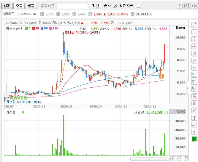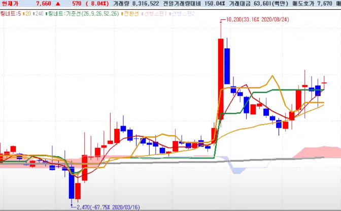 오늘 링네트(042500)가 전일대비 23%가 오른 9100원에 거래가 되다가 지금은 소폭 하락했는데요. 제가 이틀 전에 차트를 좀 들여다고 보고 있었거든요. ㅠ.ㅠ 그런데 오늘 급등을 해주네요. 솔직히 링네트, 알써포트 이런 비대면 관련주들은 코로나19 상황이 안 좋으면 더 뜨는 종목이라 조금 마음이 그렇습니다.