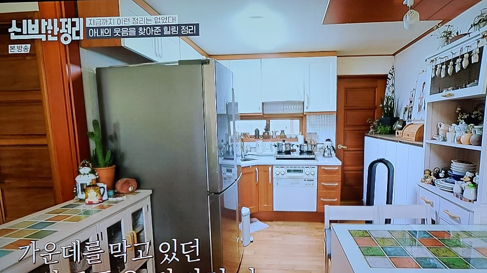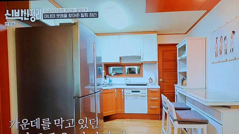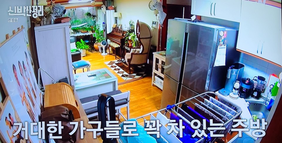 주방에까지 범람한 빨랫대, 식탁은 화분에게 양보하고 다리도 안 들어가는 아일랜드 식탁에서 조리와 식사를 겸하고 계셨어요. 송영규님은 키가 크신데 늘 다리가 안 들어가서 식사나 일을 할 때 양반다리를 하고 계셨다고 하더라고요. 두분이 고심 끝에 추억의 물건들을 처분하시기로... 처음 보는 옷들, 아이들이 어릴 때 입었던 옷들, 상태가 좋은 것들은 모두 나눔하기로... 근데 대학생 딸이 있는 분들이 굉장히 사이가 좋으시고, 친구같기도 하고, 애정이 넘치셔서 보기 좋았습니다. 역시 사랑꾼 송영규님.