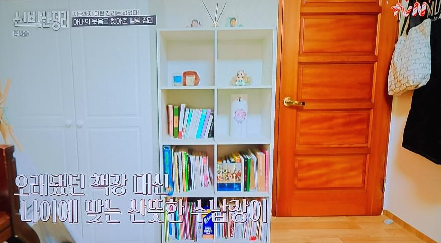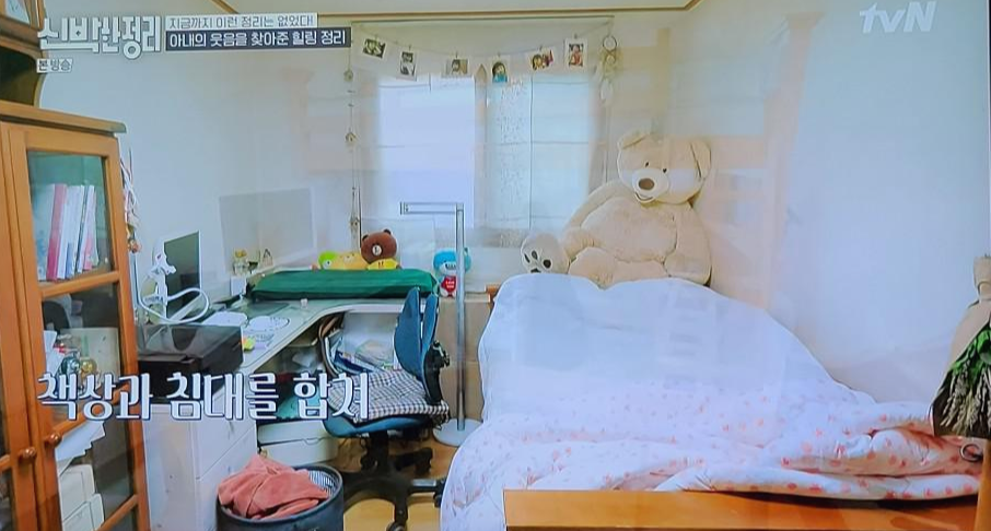 이번에는 막내 딸 방입니다. 예고에 다니는 딸이 가장 원했던 건 거실에 있는 피아노가 방으로 들어오는 것. 그리고 벙커침대 형식으로 아래는 책상, 위는 침대가 있었으면 좋겠다고 했다는데, 보시다시피 물건이 많아서 피아노가 들어올 자리는 없었습니다. 아래 보시는 책장이 바로, 송영규님 아내가 처녀때부터 쓰시던 가구라고...