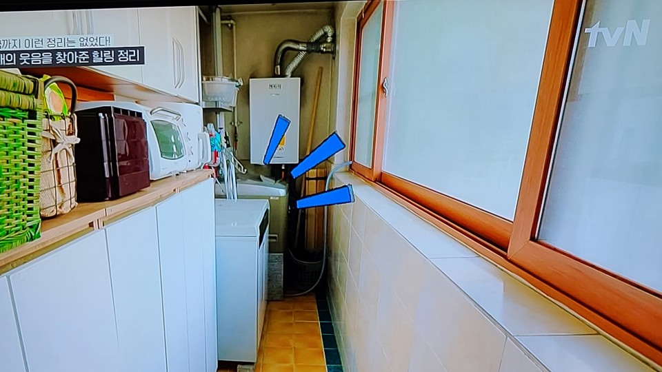 베란다(다용도실)는 주방에 있던 큰 수납장을 가져가서 물건을 수납하고, 세탁기는 방향을 돌려 사용하기 편하도록 해주셨네요. 이제는 송영규님도 다닐 수 있을만큼 공간이 확보가 되었습니다.