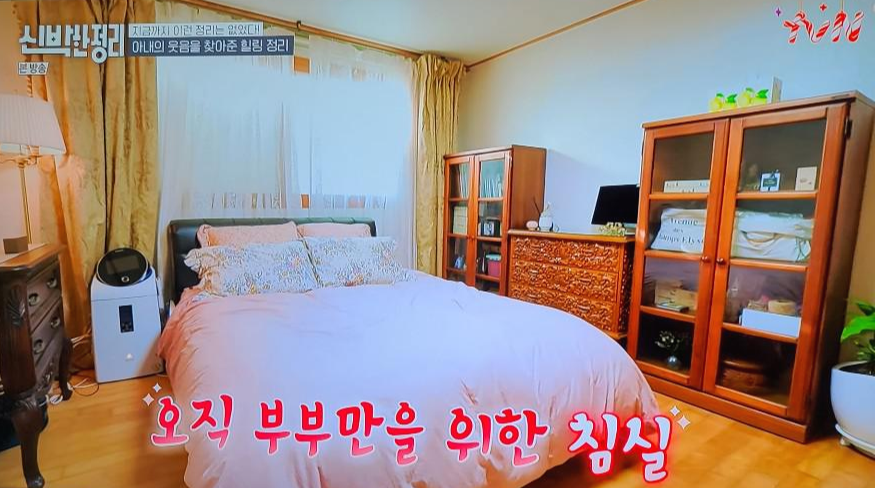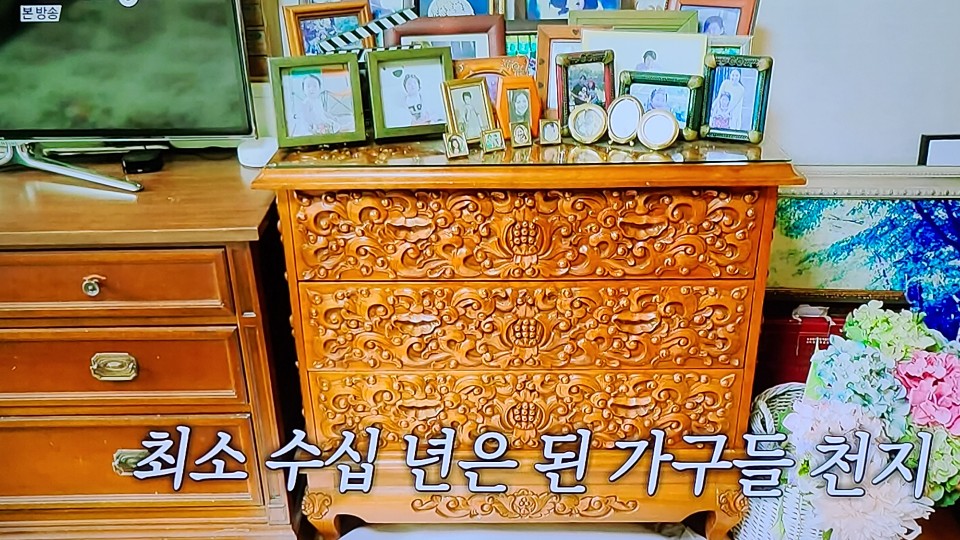 장모님이 물려주신 아래 가구는 조각이 되어있는 멋스러운 가구였어요. 저희 집에도 옛날에 저런 가구 있었는데 엄마가 다 버리셨... ㅎㅎ 송영규님의 아내분이 얼마나 꾸미는 걸 좋아하시는지, 침대를 매일 저렇게 칼각으로 정리를 하신다고 합니다. 몸이 아프셔서 그렇지 진짜 집 꾸미는 거 좋아하시는 분이신듯.
