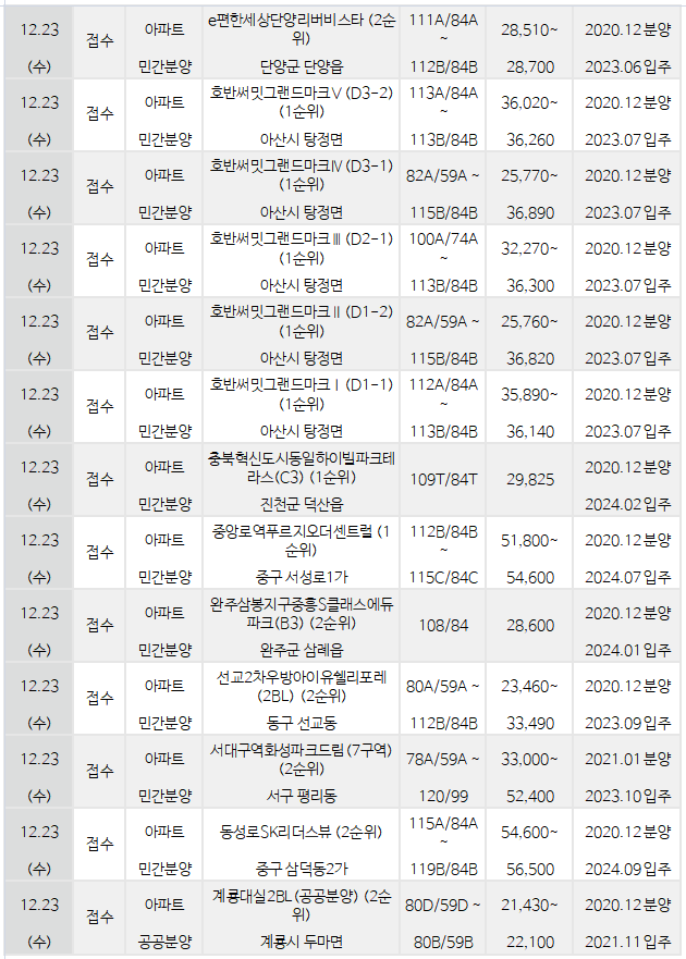 오늘의 분양정보 아파트 오피스텔 12월23일 수요일