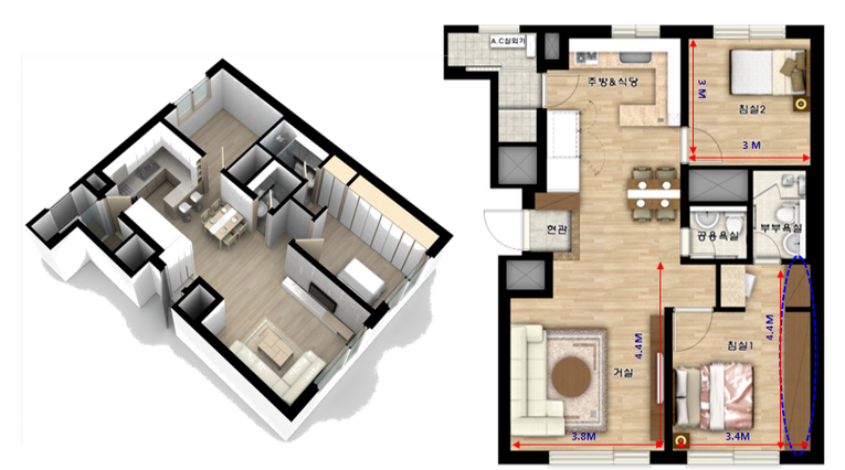방 2개 화장실 1개 타입입니다. 신혼부부나 3인 가족에게 좋은 타입인 것 같네요.