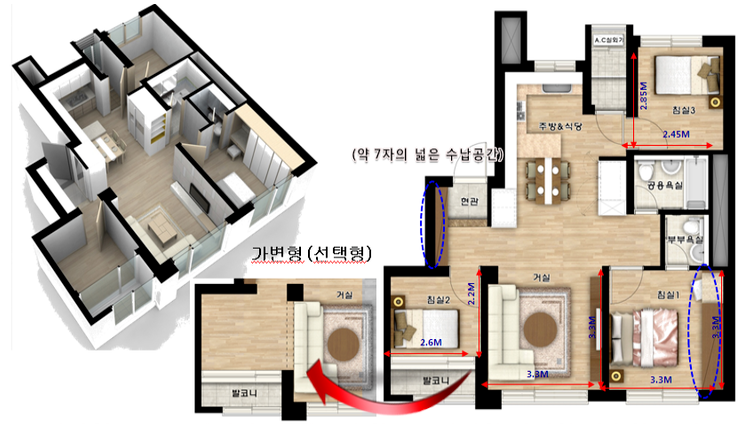 방3개 화장실2개 타입이며, 방2개 화장실 2개로 변경이 가능한 타입인데, 이미 준공이 완료되어서 일반분양의 경우에는 선택이 불가한 타입인 것 같습니다.
