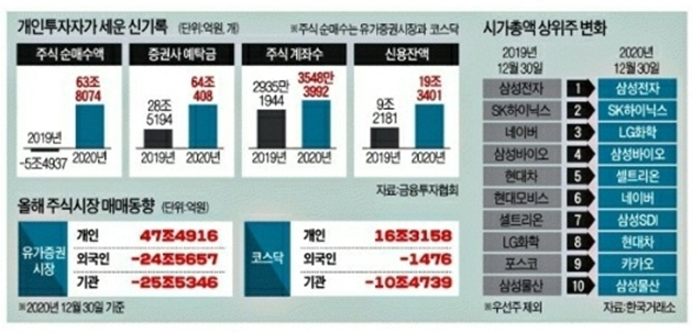 ■ 개인 64조 순매수, 코스피 2800돌파... 2020증시 새 역사 썼다 > 고객 예탁금 64조원 사상 최대, 바이오, 2차전지주 시총 상위주로
