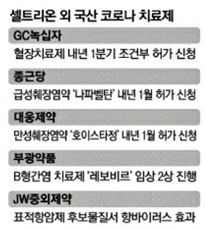 ■ 셀트리온 말고 우리도 있어요... 토종 코로나치료제 잇단 신청대기 > 국내 20사 코로나 치료제 개발... GC녹십자 내년 상반기 허가 신청, 종근당은 내년 1월 조건부 신청, JW중외, 렘데시비르 2배 효과
