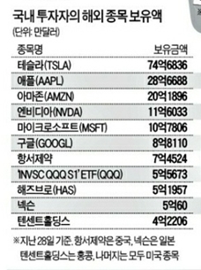 ■ 믿을 건 미 주식.... 서학개미, 올해 21조 사들였다 > 테슬라 보유액 74억불로 최대, 애플, 아마존, 엔비디아 순