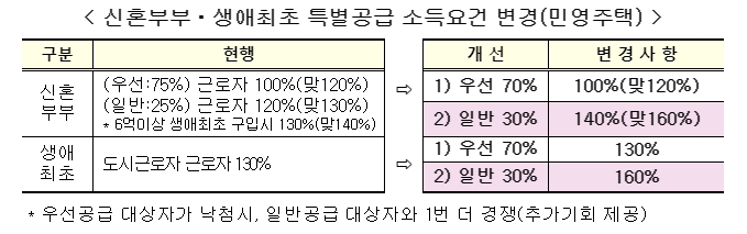(1) 우선공급 비율: 75% 70%로 축소, 소득기준은 도시근로자 월평균 소득의 100%(맞벌이 120%) → 변동 없음