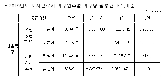 1. 신혼부부 특별공급 소득요건의 경우 (월평균 소득기준 아래 이미지 참조)