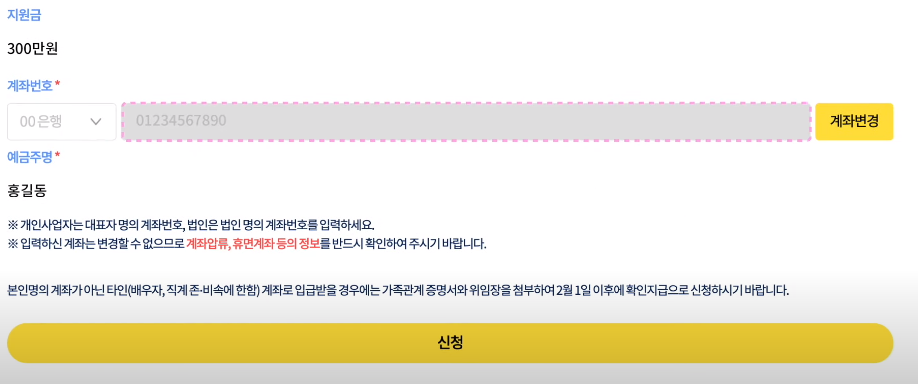 (9) 새희망자금 수령 이력이 있으면 계좌번호가 자동으로 입력되어 표시됩니다. 계좌번호도 변경이 가능하지만, 꼭 대표자명 혹은 법인명과 동일해야 합니다. 법인은 법인계좌번호를 입력하고, 입력한 계좌는 변경이 불가하므로, 사용이 가능한 계좌인지 미리 확인해주세요.