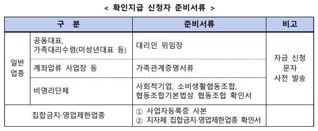 □ 개인사업자의 경우 대표자, 법인은 법인명의 계좌가 원칙이나 미성년대표자, 계좌압류자 등은 가족관계증빙서류를 첨부하여 별도 계좌로 확인지급 신청(2월) 가능