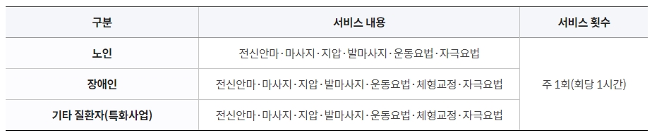 - 자격에 따라 월 2회 안마서비스를 받을 수 있는 것과 월 4회 받을 수 있는 것이 있음