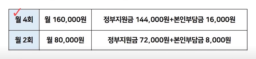 - 1개월에 4회 안마서비스를 받을 경우, 총 비용 16만 원 중 정부가 144,000원 지원, 본인은 16,000원만 부담