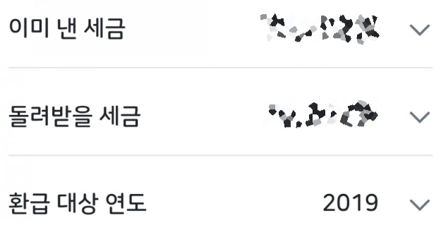 6. 환급 대상 연도라는 것이 2019년도만 나왔는데, 아래 화살표를 클릭하시면 년도별로 5년간의 환급 가능한 세금이 있는지 없는지 등이 나오니 참고하시면 좋을 것 같네요.