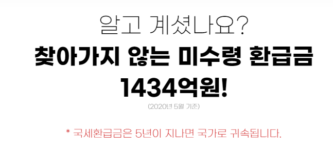 5년동안 찾아가지 않은 미수령 환급금이 1434억 원이라고 하네요. 아~ 나 10%만 주라! 하고 싶네요. ㅎㅎㅎ 5년이 지나면 영영 받을 수 없는 돈이니 어서 찾아보자고요!