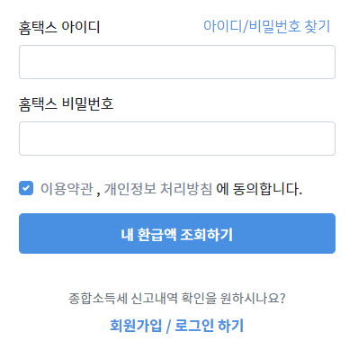 3. 국세청 홈택스 아이디와 비밀번호를 입력해주세요. 만약 아이디가 없다면 아래 회원가입/로그인하기를 눌러주세요. 카톡을 통해 조회하실 수 있다고 나오네요.
