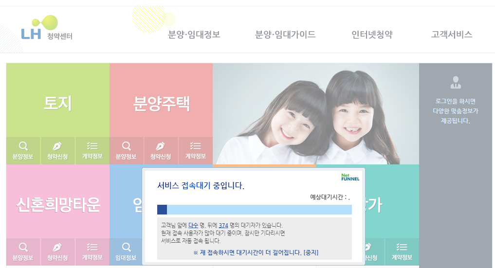 현재 LH청약센터 홈페이지는 접속량이 많아 계속 대기중이라고 뜨네요. 청약접수 전에 본인이 자격이 되는지 등 확인해보시고 접수하면 좋을 것 같습니다.