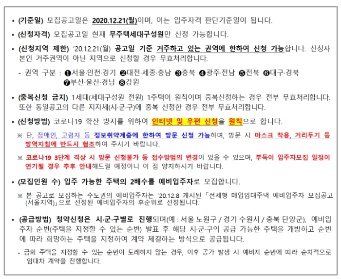 - 2020년 12월 21일 기준 무주택자로, 해당 거주지역에 한해 신청 가능