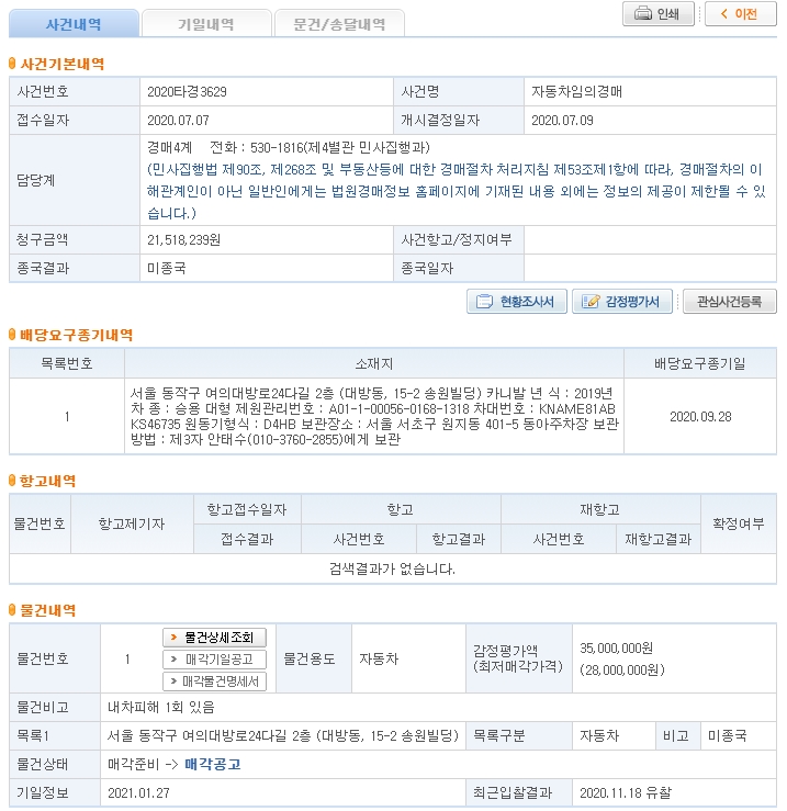 6. 사건내역에서는 사건번호, 물건내역을 확인합니다. (차대번호조회를 활용하면 출고가격을 확인할 수 있습니다)