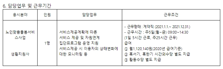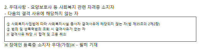 - 특별한 자격 요건은 없고 정년 제한도 없지만 요양보호사, 사회복지사 자격증 소지자 우대, 인근 거주자 우대, 컴퓨터가능, 차량 소지자 우대
