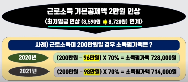 - 최저임금이 8,590원에서 8,720원으로 인상 됨에 따라 근로소득 기본 공제액도 2만 원이 인상