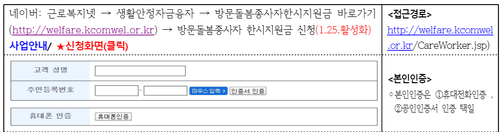 - 신청사이트: 근로복지서비스 누리집(welfare.kcomwel.or.kr/CareWorker.jsp) PC에서만 가능