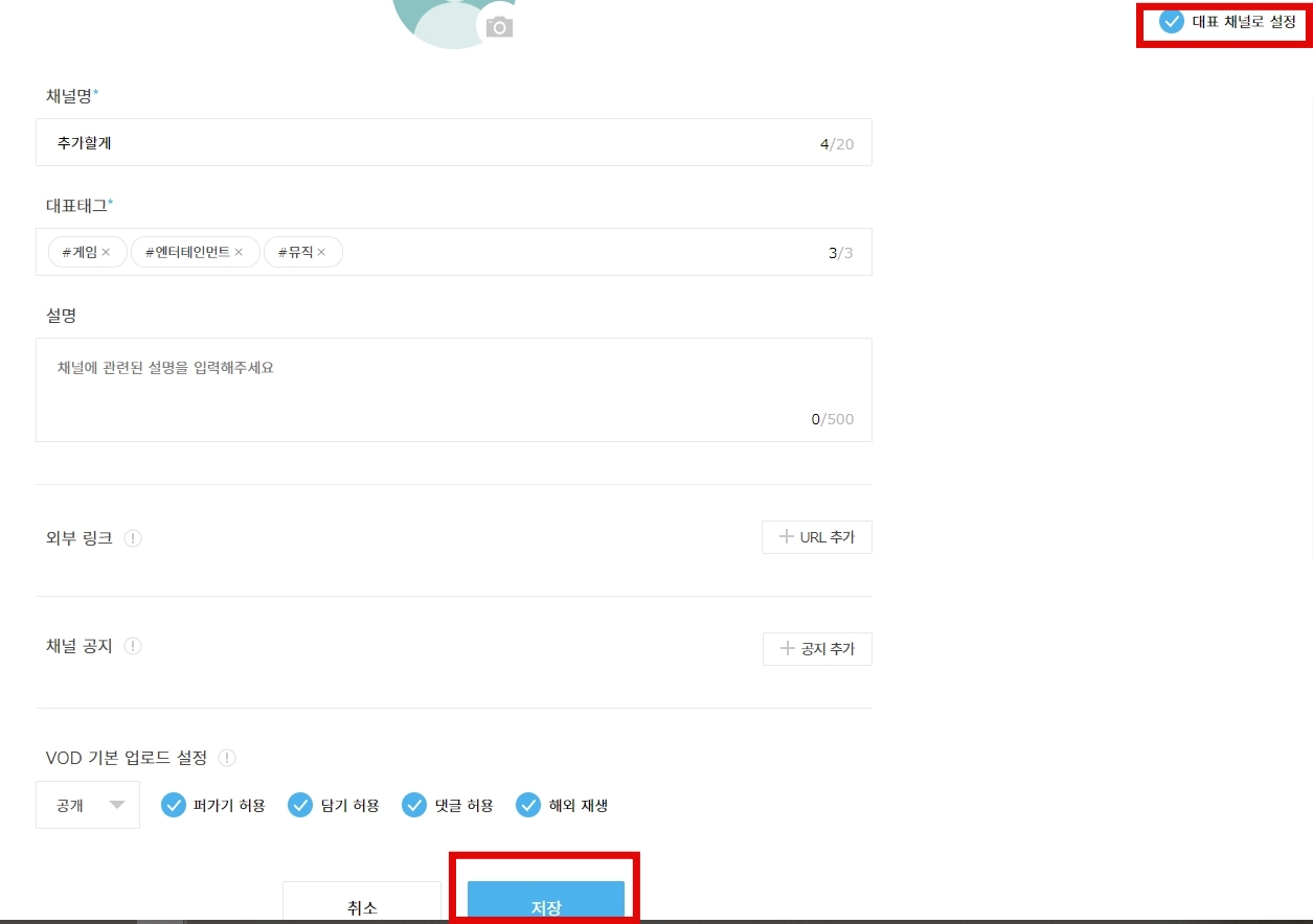 이때 주의할 점! 반드시 대표 채널로 설정을 체크하고 저장 눌러야 합니다.