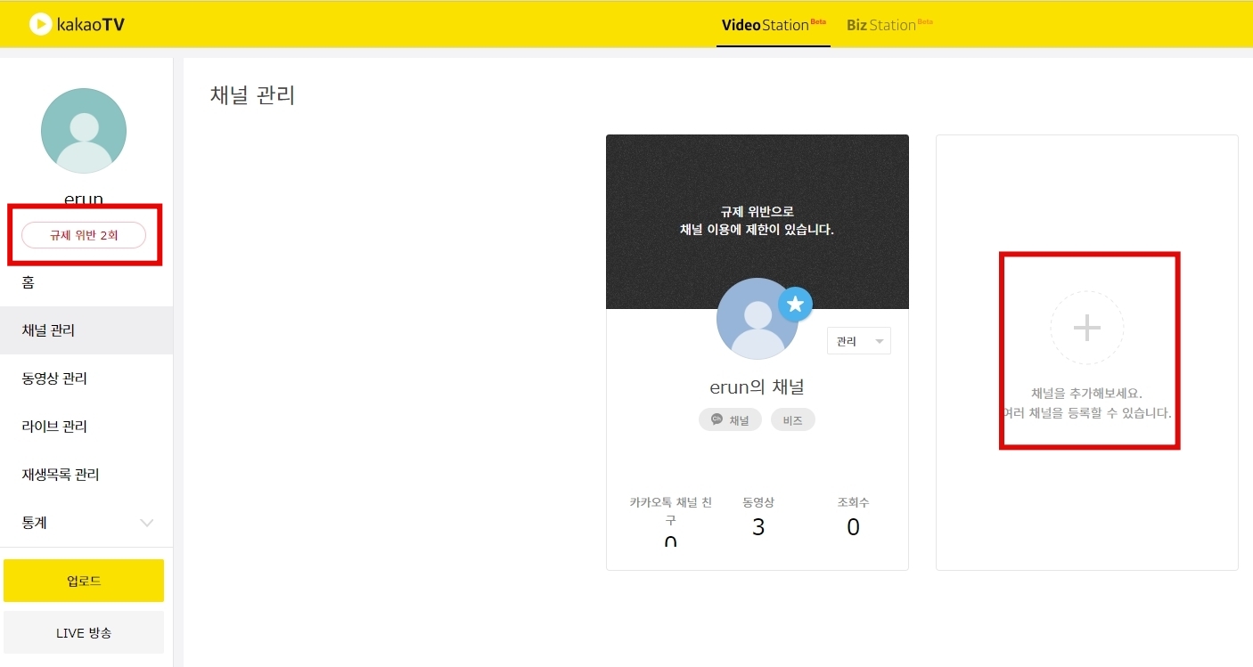 이 채널은 규제로 인해 동영상 업로드가 제한되었습니다. 라는 메시지가 떴습니다.